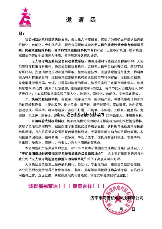 本公司創(chuàng)新產(chǎn)品深受用戶歡迎,2018年9月棗礦集團在岱莊煤礦選煤廠成功召開了“棗礦集團煤場封閉暨儲裝運系統(tǒng)智能化升級改造現(xiàn)場會”,會上棗礦集團各級領(lǐng)導對我公司“無人值守旋連全息稱重自動裝載系統(tǒng)”給予了高度認可和好評。